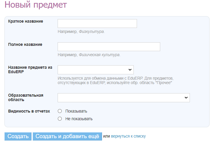 - ввести краткое (для отображения в расписании) и полное название предмета;