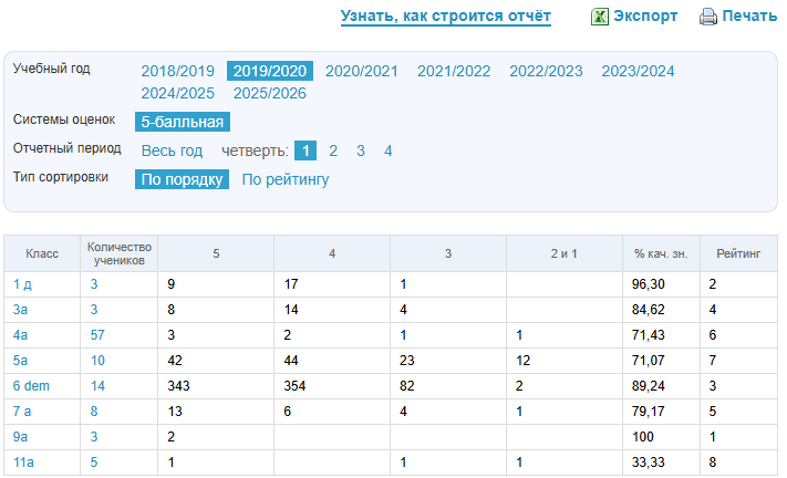 - рейтинг класса (формируется на основании значений столбца «% кач. зн.»).
