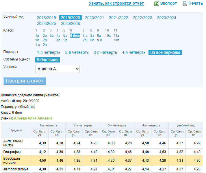 - В отчёте за весь год высчитывается средний балл, формируемый на основе средних баллов обучающегося по каждому отчётному периоду.