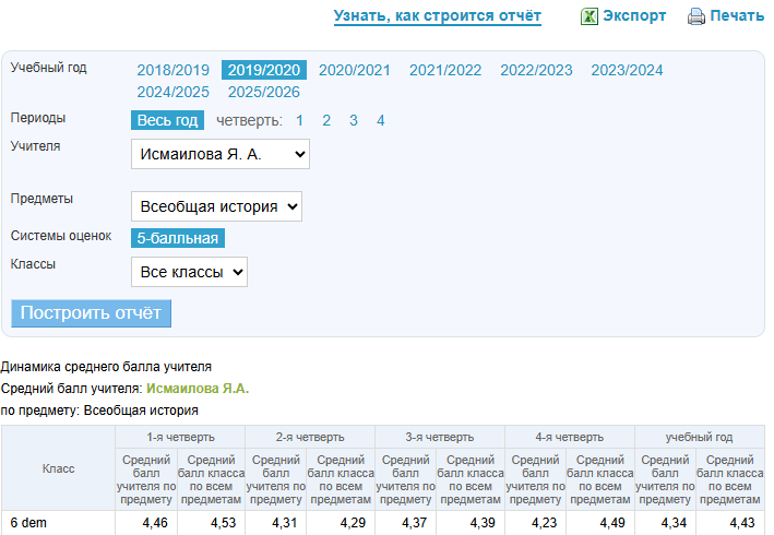 - В отчёте за весь год высчитывается средний балл, формируемый на основе средних баллов учителя по каждому отчётному периоду.