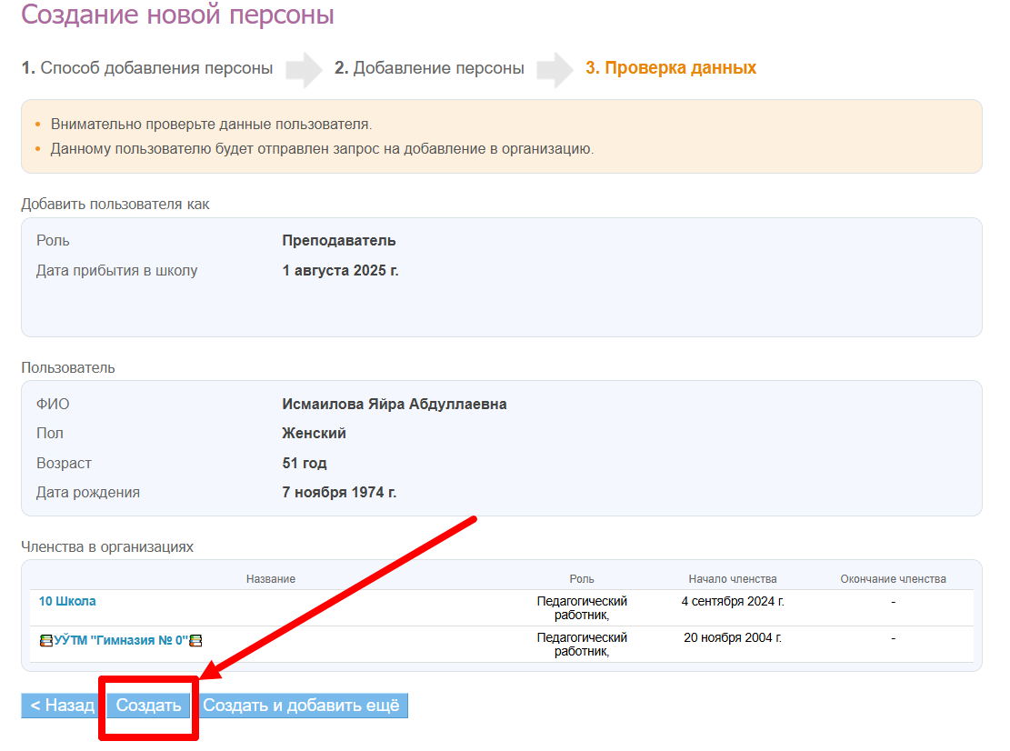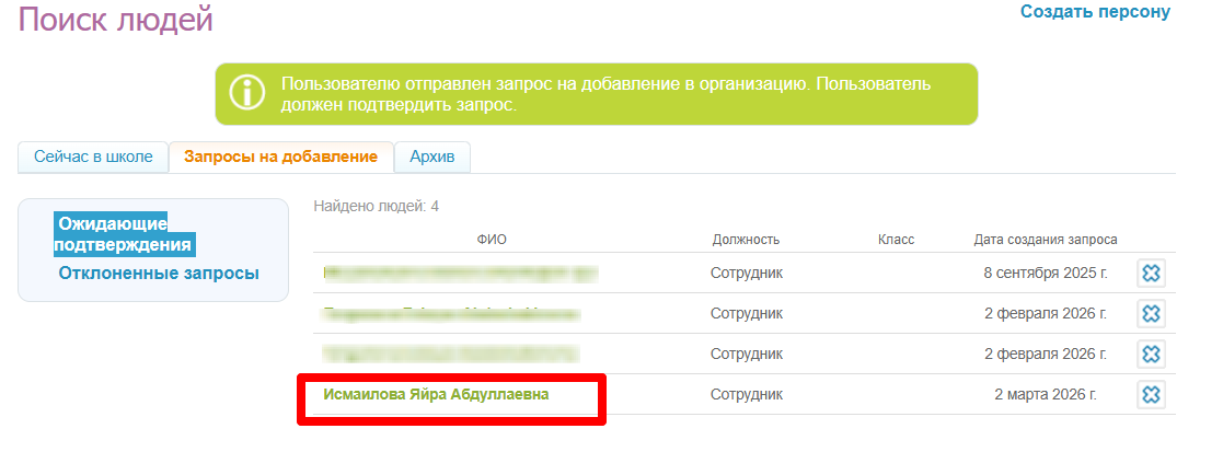После добавления в организацию пользователю будет доступна образовательная информация из этой организации, также его ФИО исчезнет из списка «Ожидают подтверждения» в разделе «Администрирование» - «Список людей».