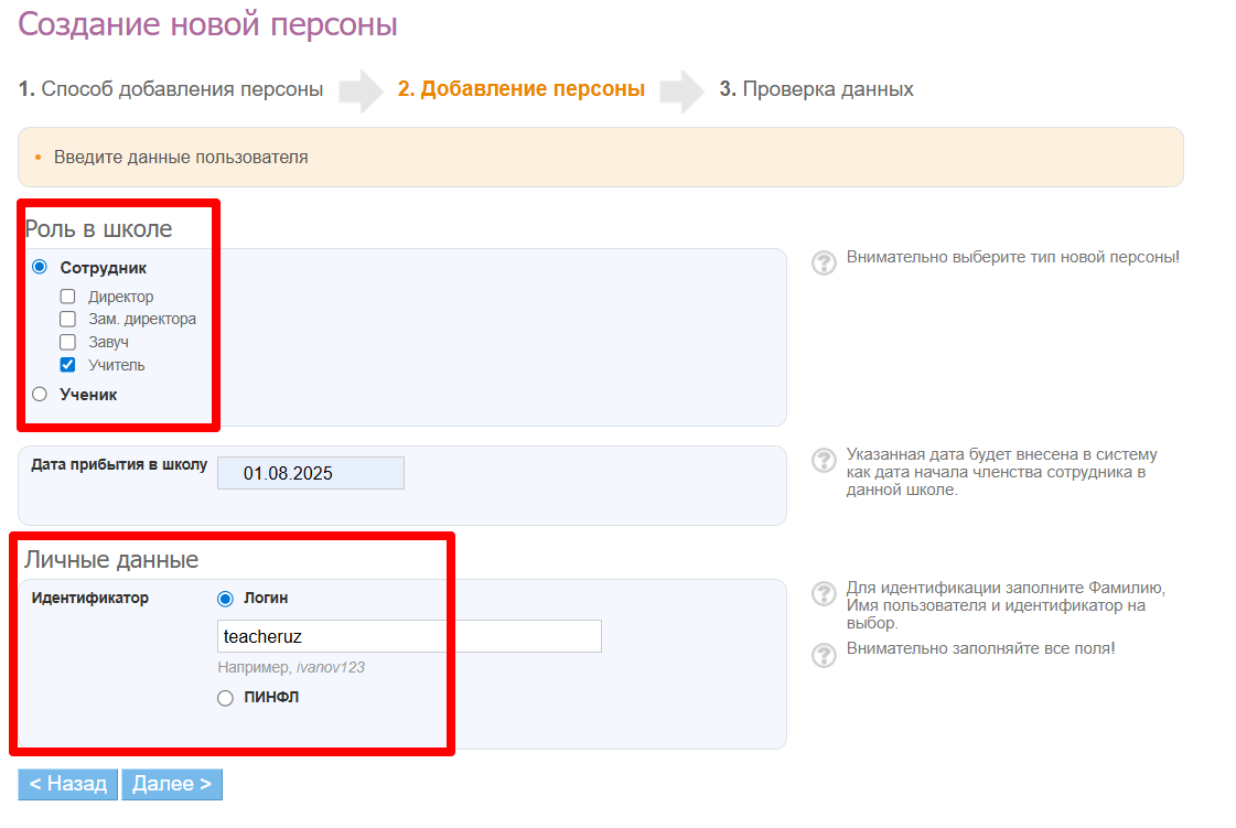 2. Выбрать вариант добавления «Существующий пользователь в системе».