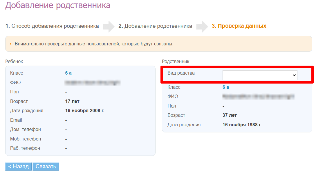 7. После ввода данных система проверит информацию, и если ошибок не найдено, необходимо подтвердить добавление родственной связи.