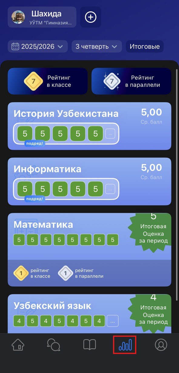 - информации о среднем балле и итогах недели;