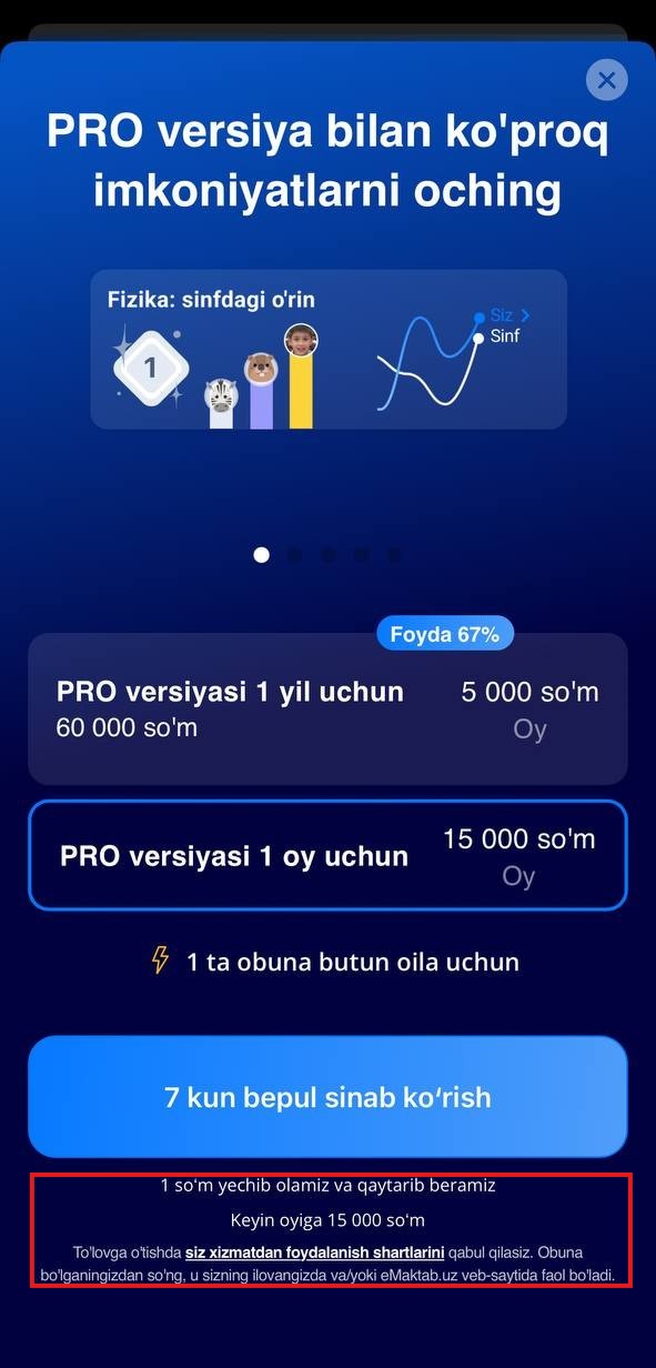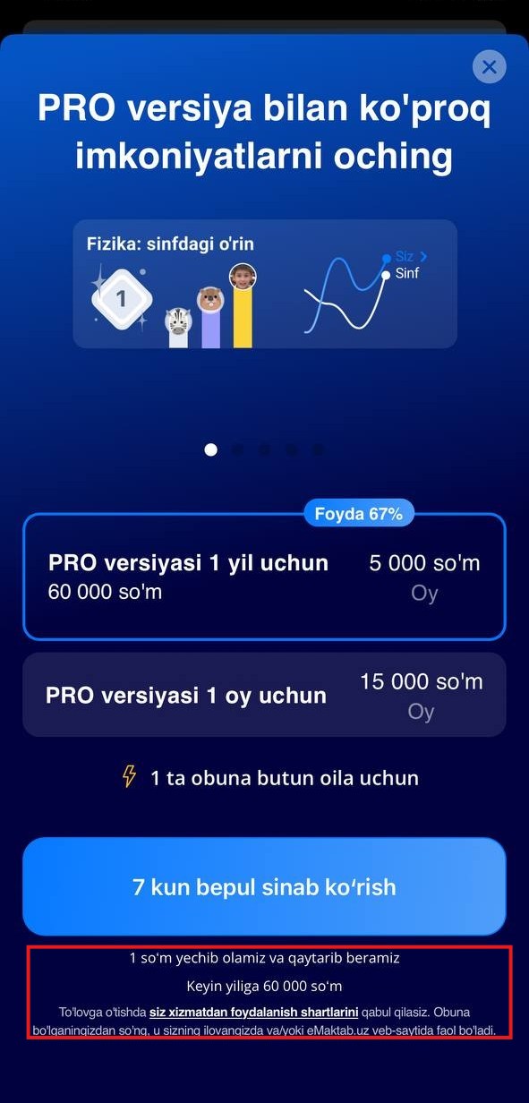 eMaktab.Oila ilovasi orqali PRO obunasi uchun to‘lovlar