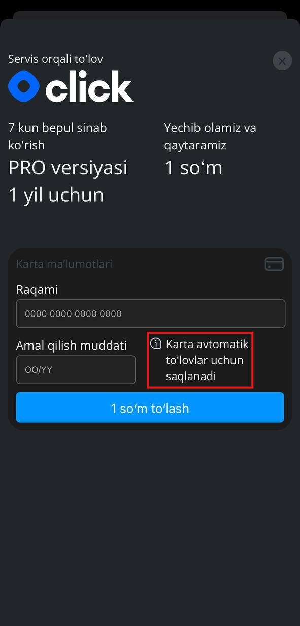 Yillik obunani xarid qilganda, ilovadan foydalanishning birinchi 7 kun bepul taqdim etiladi. Obuna to‘lovi 7 kundan keyin avtomatik ravishda kartadan yechiladi.