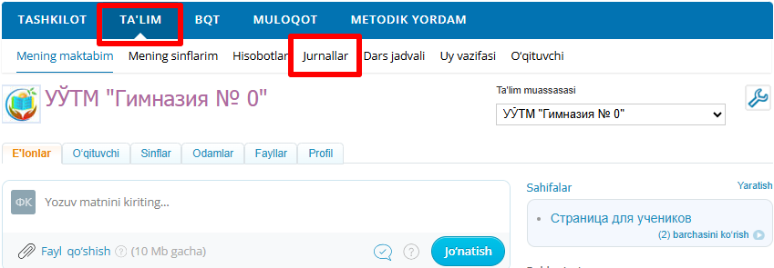 BSB/CHSBni berish uchun siz "Ta'lim" yorlig'idan "Jurnallar" bo'limini tanlashingiz kerak bo'ladi.