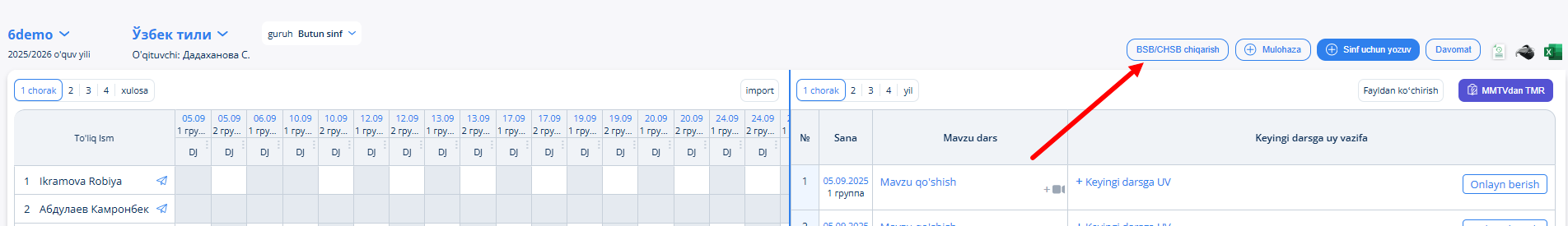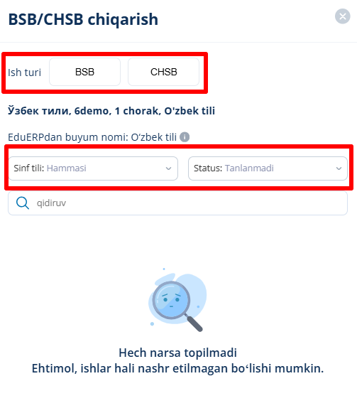 Keyinchalik, siz BSB/CHSB bermoqchi bo'lgan sinf va fanni tanlashingiz kerak bo'ladi.