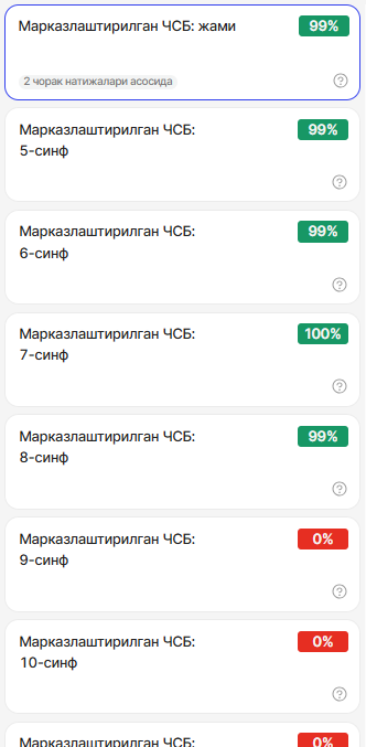 "Markazlashtirilgan CHSBdan o'tish" Ko‘rsatkich 5-11-sinflarning onlayn test formatida markazlashtirilgan CHSBni tamomlagan o‘quvchilari ulushini avtomatlashtirilgan kuzatish uchun mo‘ljallangan. Bu ko‘rsatkich CHSBni topshirishi kerak bo‘lgan, lekin topshirmagan o‘quvchilarni o‘z vaqtida aniqlash imkonini beradi.