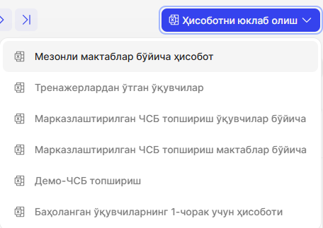 Izoh: Hisobot faqat onlayn formatda CHSB topshiradigan kriterial maktablarni o‘z ichiga oladi. Hisobotdagi ma’lumotlar hajmi yuklab olish darajasiga (maktab, tuman va h.k.) bog‘liq.