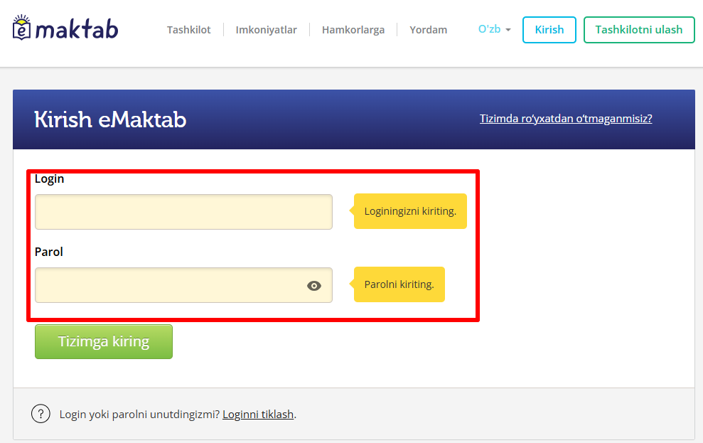 Ro‘yxatdan o‘tish vaqtida kiritiladigan login va parolni olish uchun, ota-onalar va o‘quvchilar ta'lim tashkilotidagi ma'lumotlarni to‘ldirish bo‘yicha mas'ul bo‘lgan xodim, ya'ni, ta'lim tashkilotining ma'muri bilan bog‘lanishlari kerak. Agar ma'mur haqida ma'lumot bo‘lmasa, u holda sinf rahbariga murojaat qilish mumkin.
