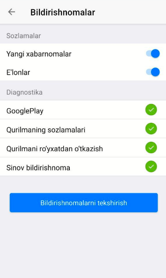 "Bildirishnomalar" tugmachasidan foydalanib, ilovadan xabarnomalarni yoqishingiz yoki o‘chirib qo‘yishingiz mumkin, shuningdek, telefon sozlamalarida ilovadan xabar yuborish uchun ruxsat yoqilganligiga ishonch hosil qilish uchun bildirishnomalar ishining diagnostikasini ko‘rishingiz mumkin.