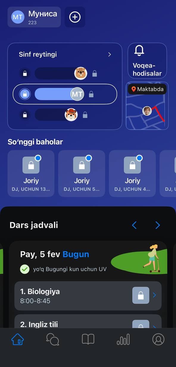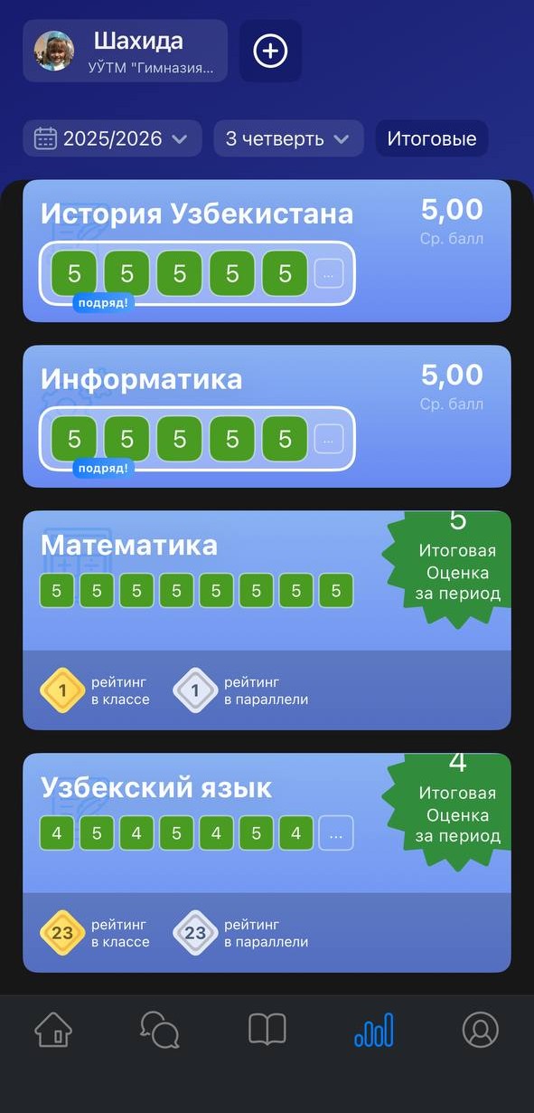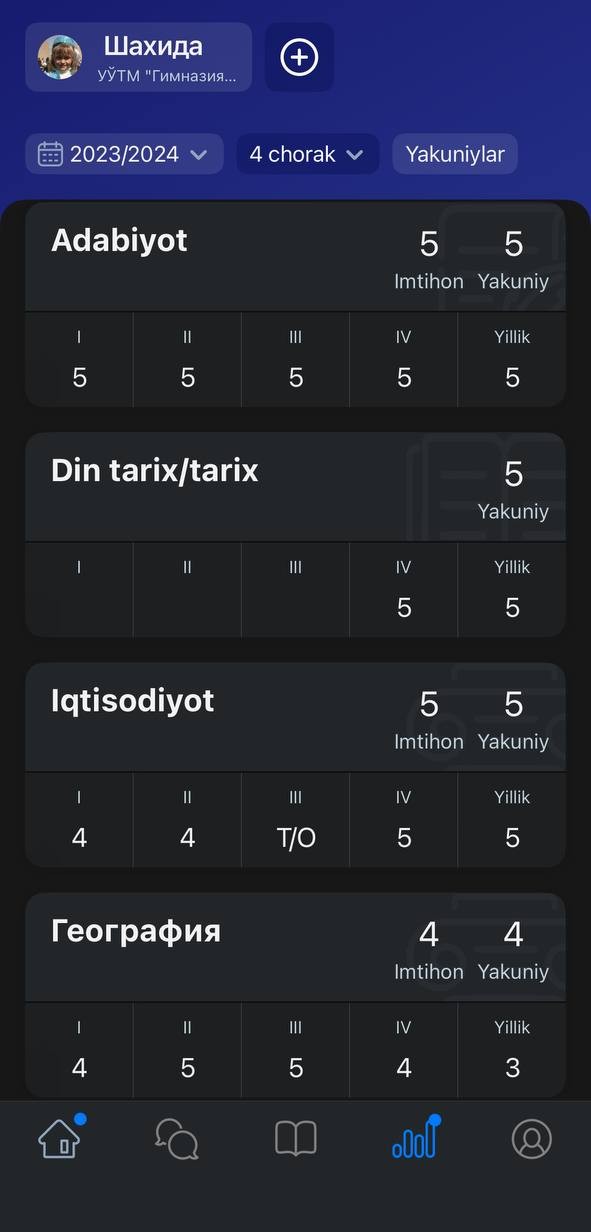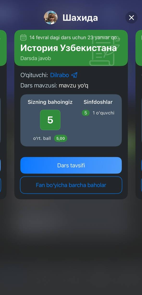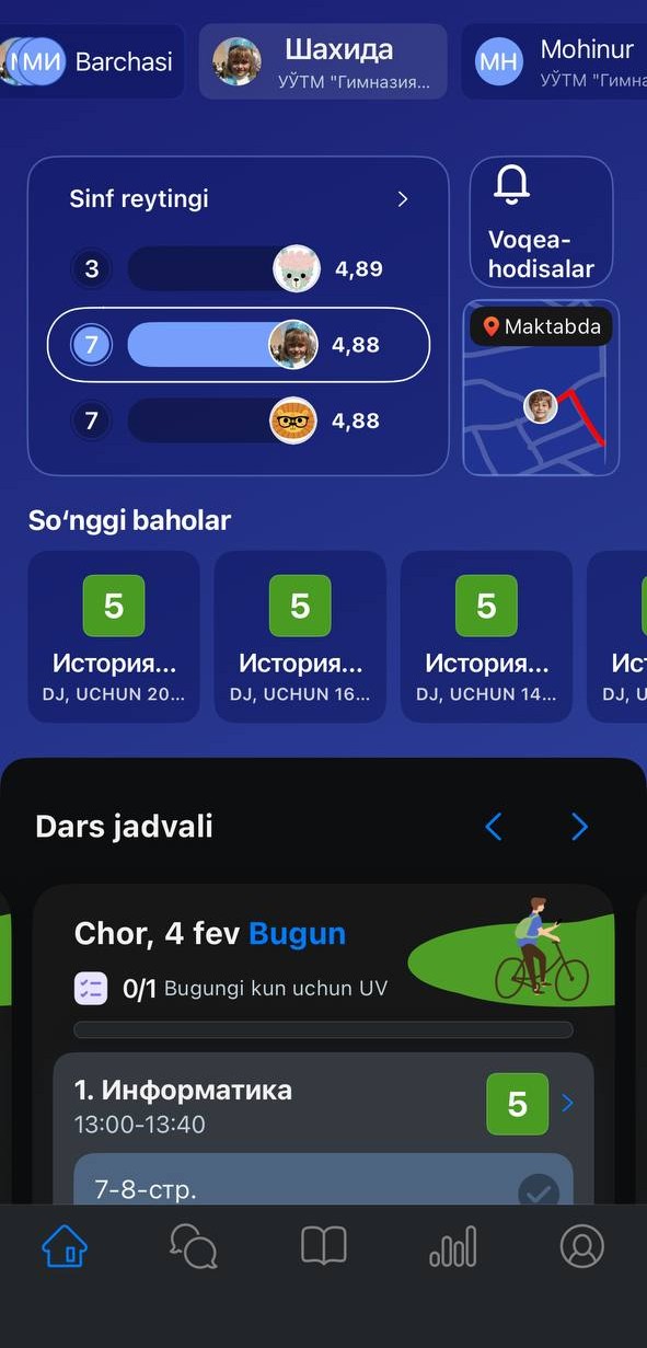 ota-ona boshqa farzandlari haqida ma'lumotni ko‘rish uchun ekranning yuqori qismidagi bolaning avatarini bosishi kerak.