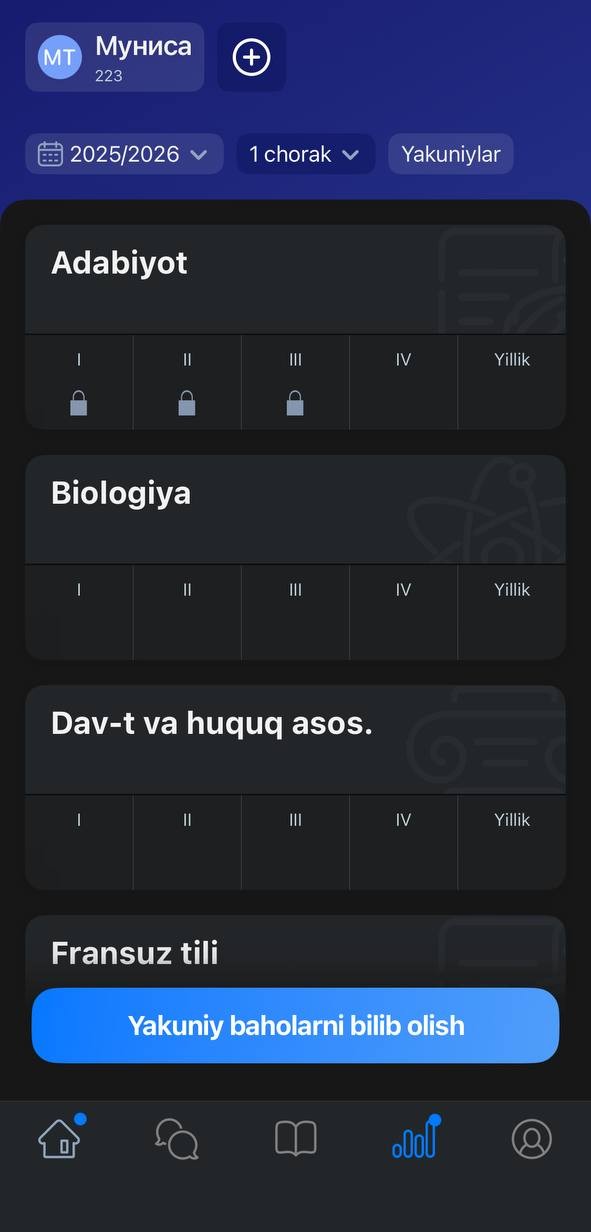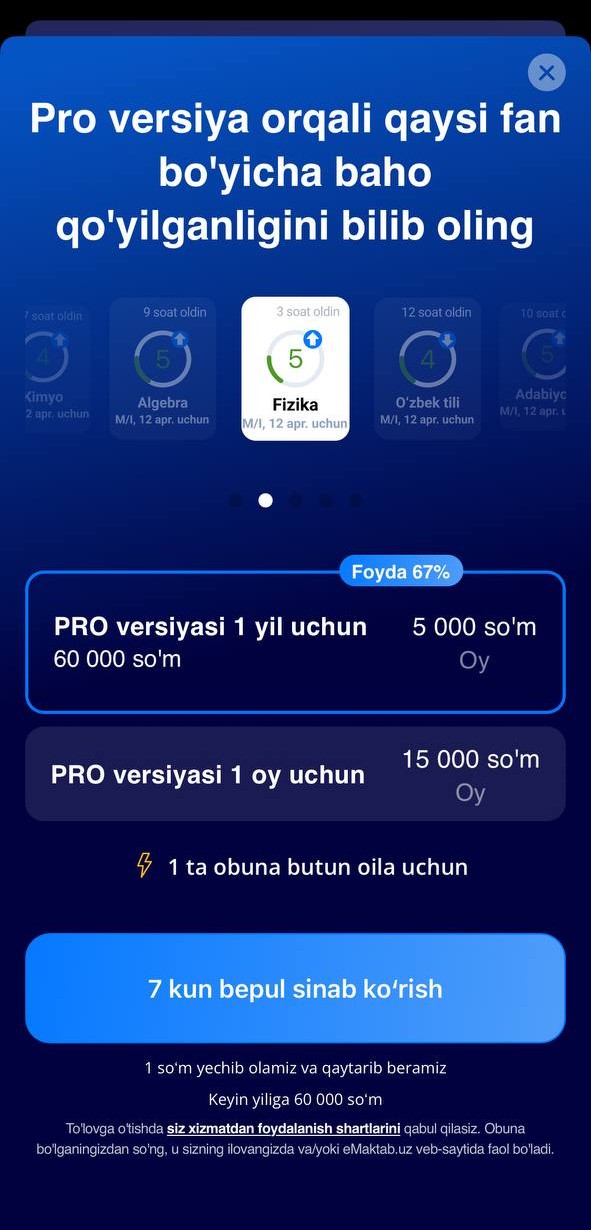 Bepul muddati tugagandan so‘ng, boshqa bo‘limga o‘tishga yoki baho qaysi fan va faysi ish uchun ekanligini ko‘rishga harakat qilganda, tizim obuna turlarini tanlashni taklif qiladi.