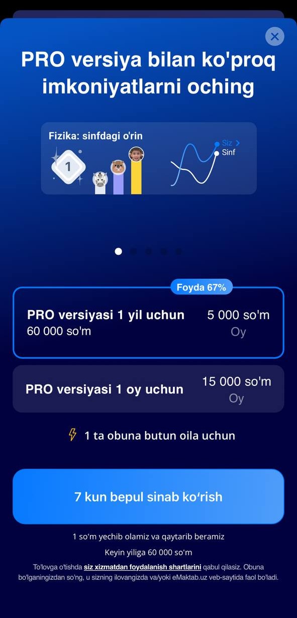 Muhim: eMaktab.oila ilovasi pulli bo`lib ko`p funksiyalari to`lovsiz mavjud bo`lmaydi.