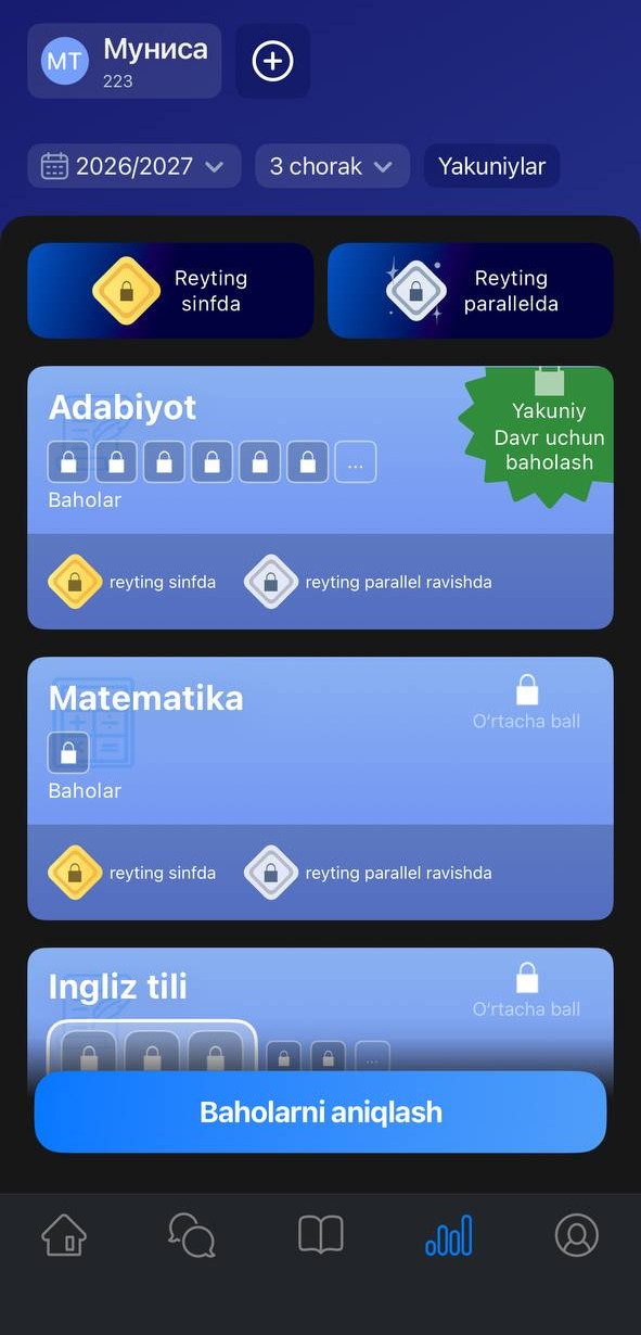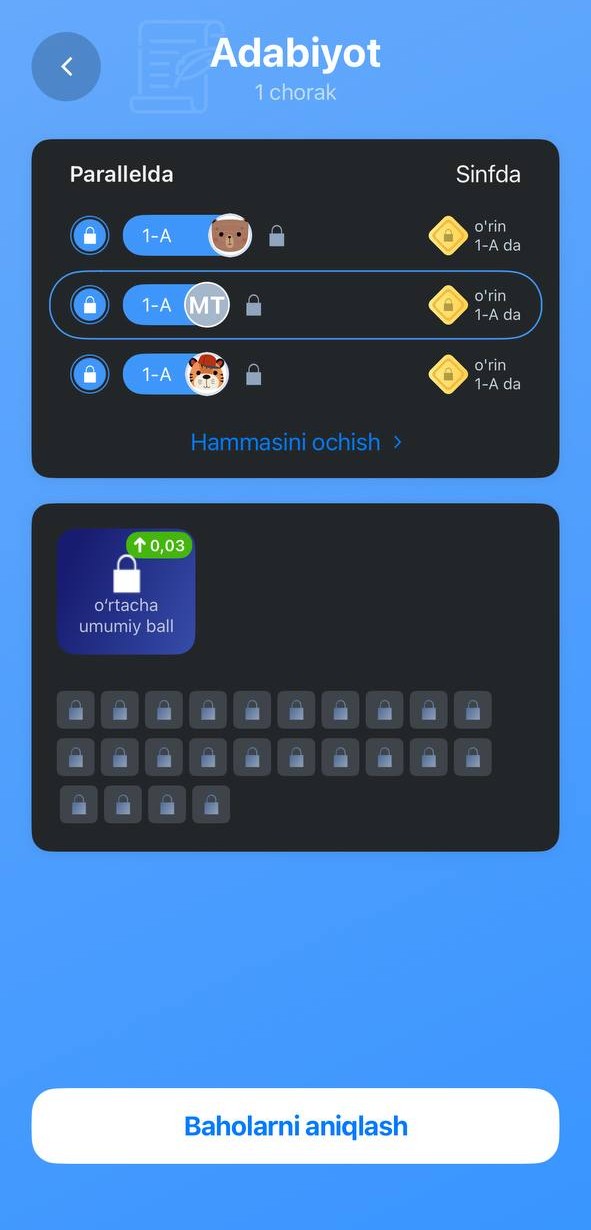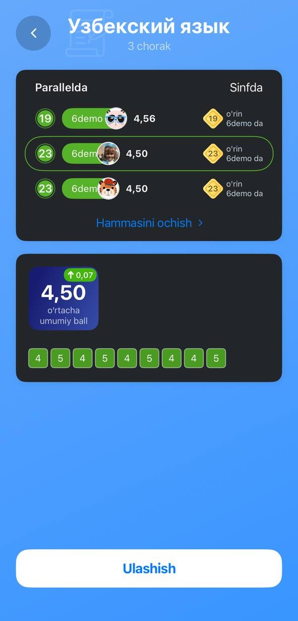 "Muhim" vidjetining "Reyting" yorlig‘ida, reyting qiymatining o‘ng tomonidagi o‘qini bosganingizda, sinfdagi umumiy reytingi ko‘rsatilgan ekranga o‘tasiz.
