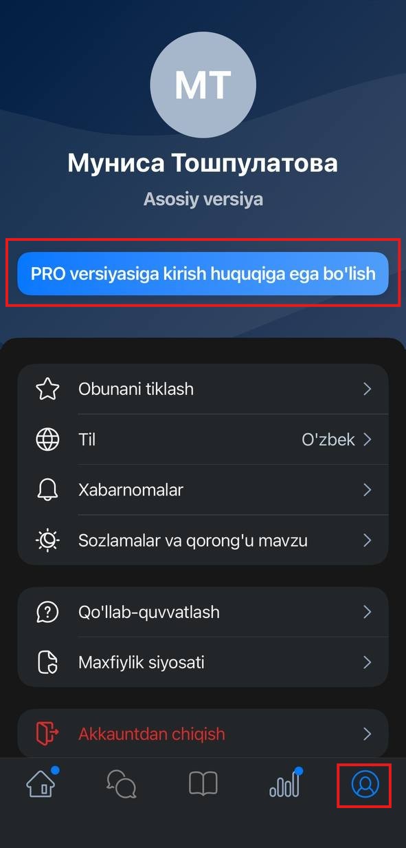 Eslatma: "O‘zlashtirish" vidjetidagi ta'lim to‘g‘risidagi ma'lumotlar faqat PRO versiyasiga obuna bo‘lgandan so‘ng mavjud bo‘ladi.